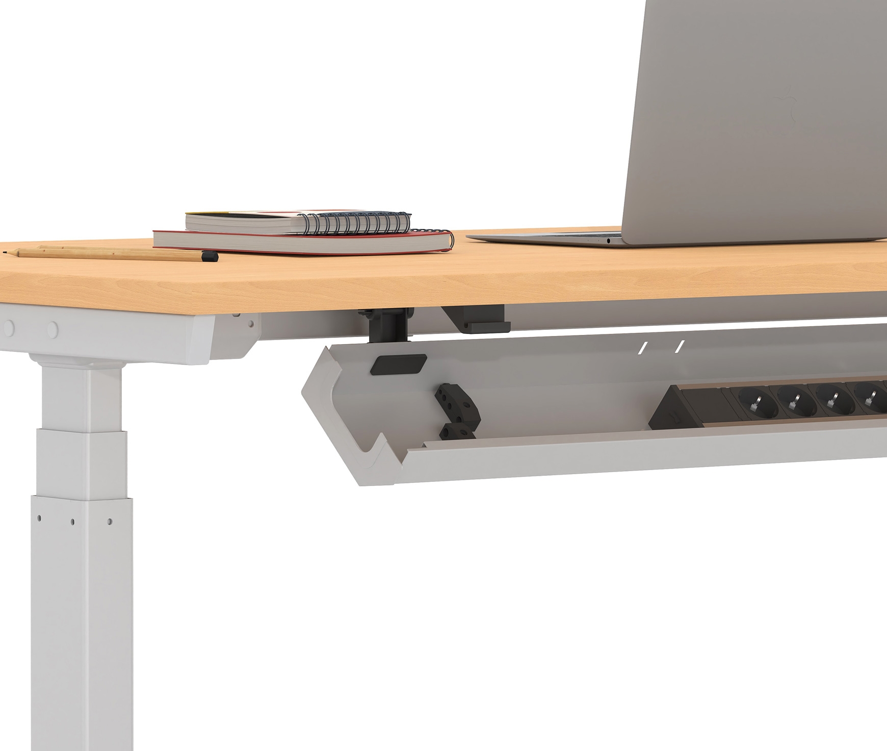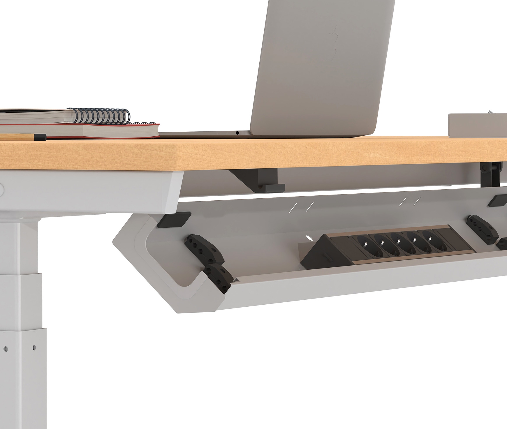 The modular cable channel is placed under the desk surface and is essential for maximum safety and ergonomics. It can be placed in all DROMEAS company offices and is available in a wide variety of colors