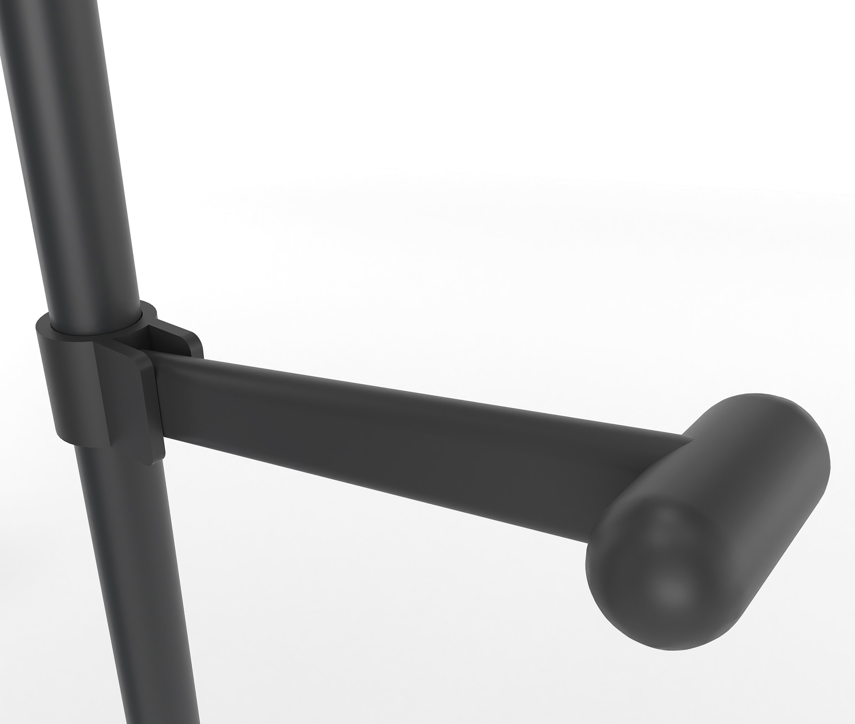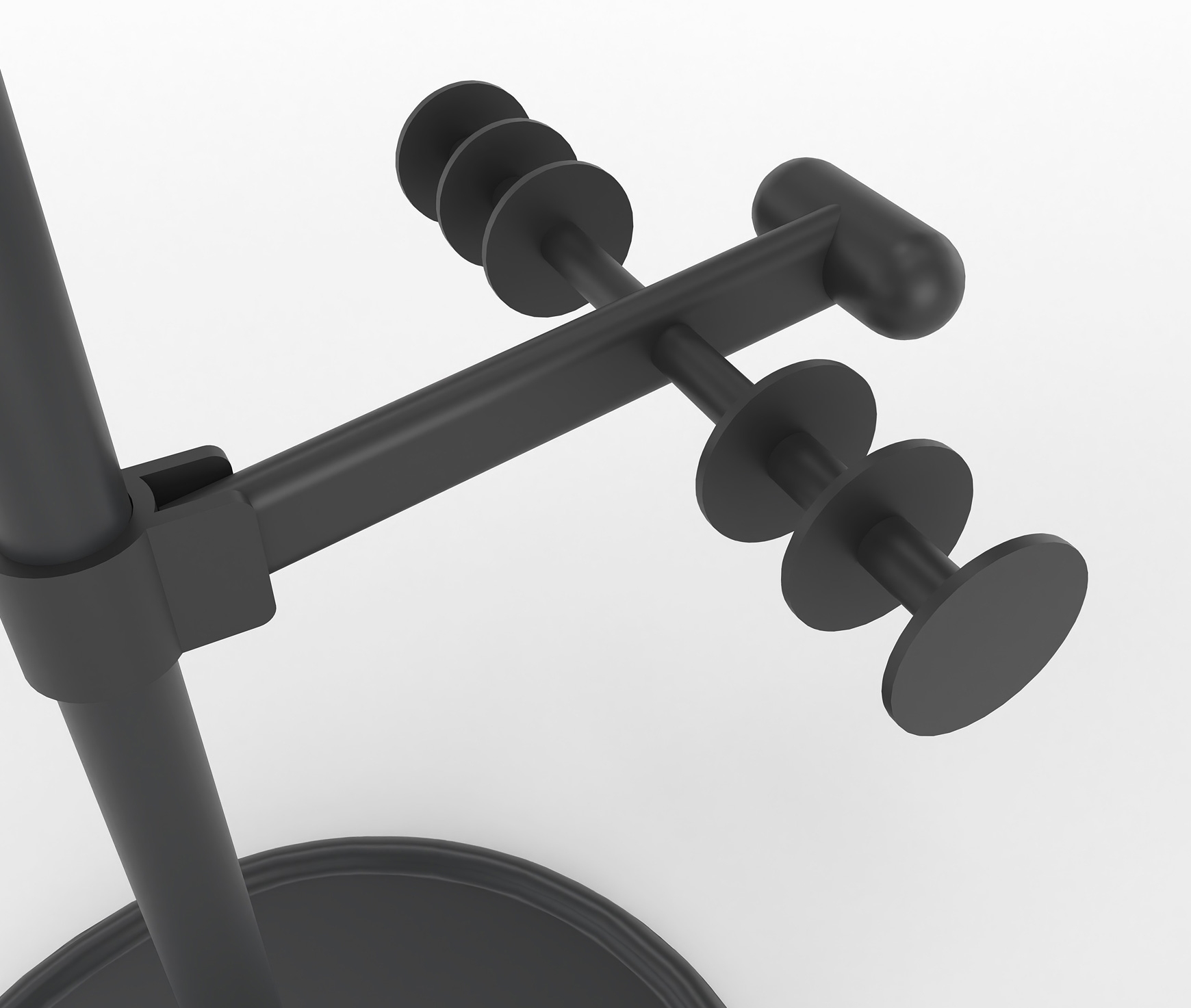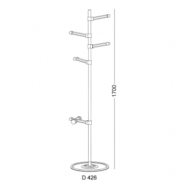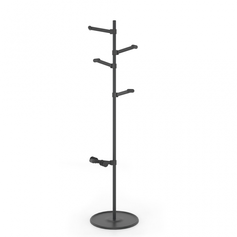 Coathanger made of metal tube and plastic base with counterweight. It has four plastic adjustable hanging arms and an adjustable umbrella holder. The base is designed in such a way as to retain water during drainage. Available in black.