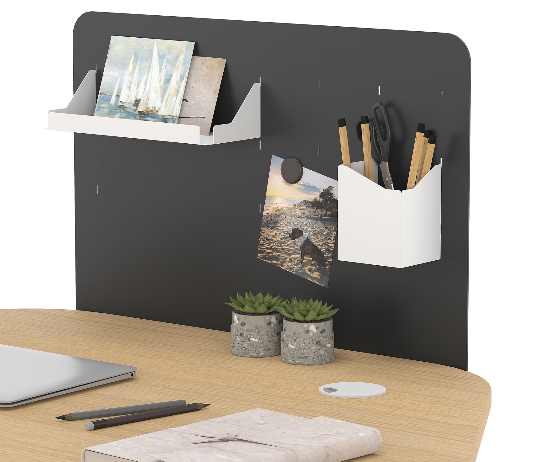 OPTIONAL EQUIPMENT – The desk can optionally be equipped with a metal or fabric partition, 5-position multi-socket, cable spine and adjustable PC stand
