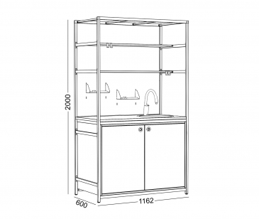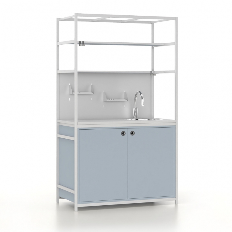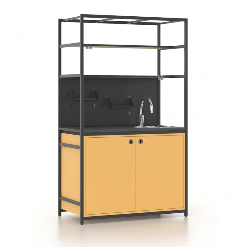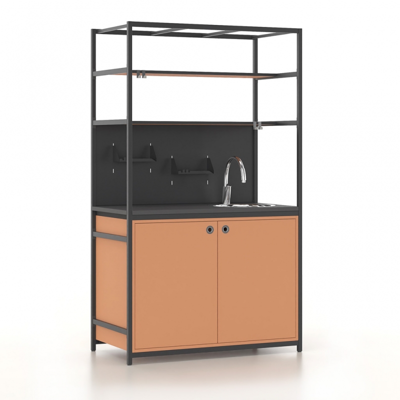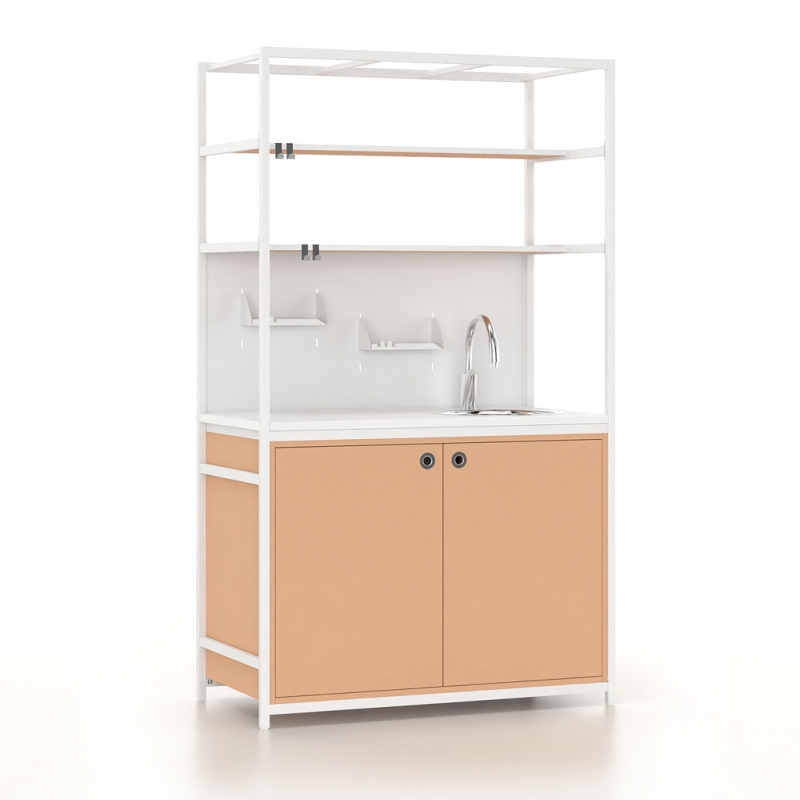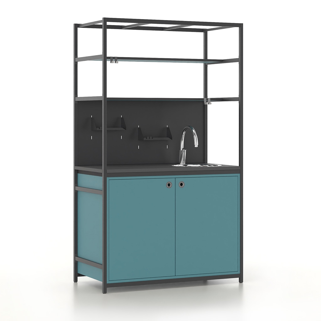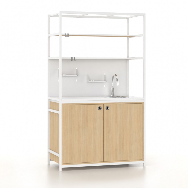 With clean lines and advanced modular construction, Syntheka Estia integrates a sink, faucet, open shelving, and storage compartments into a compact and highly adaptable unit.