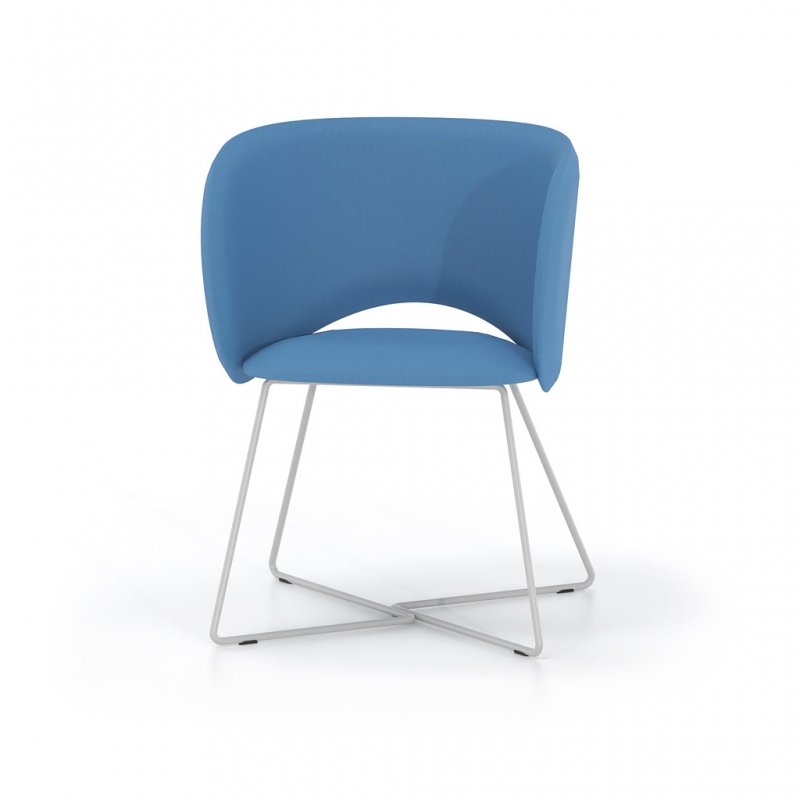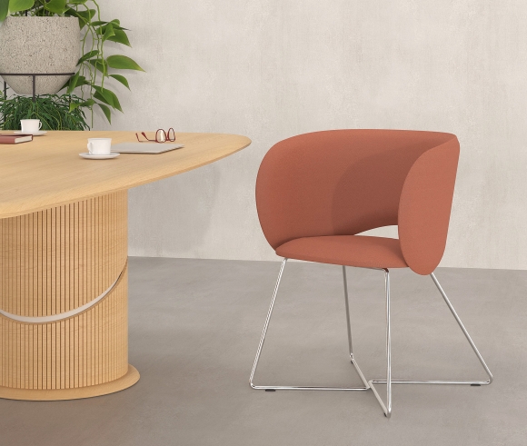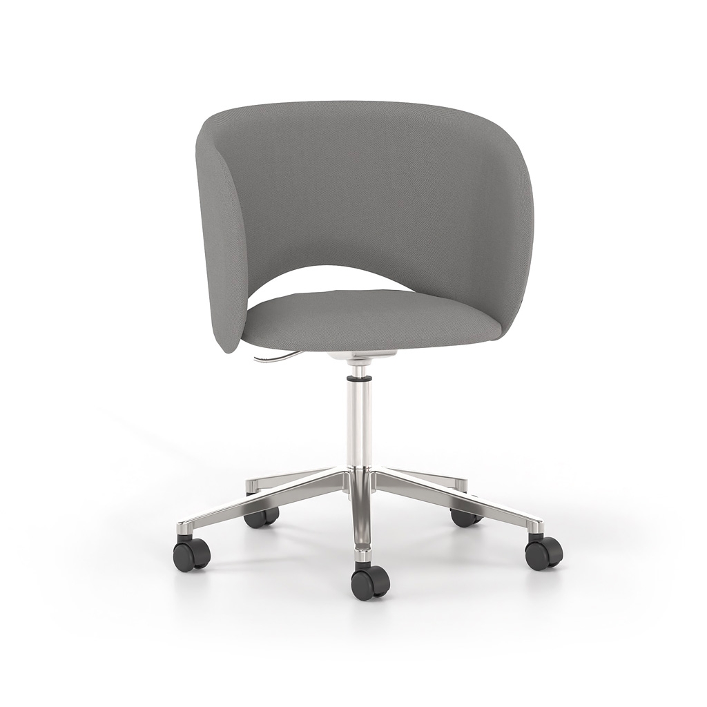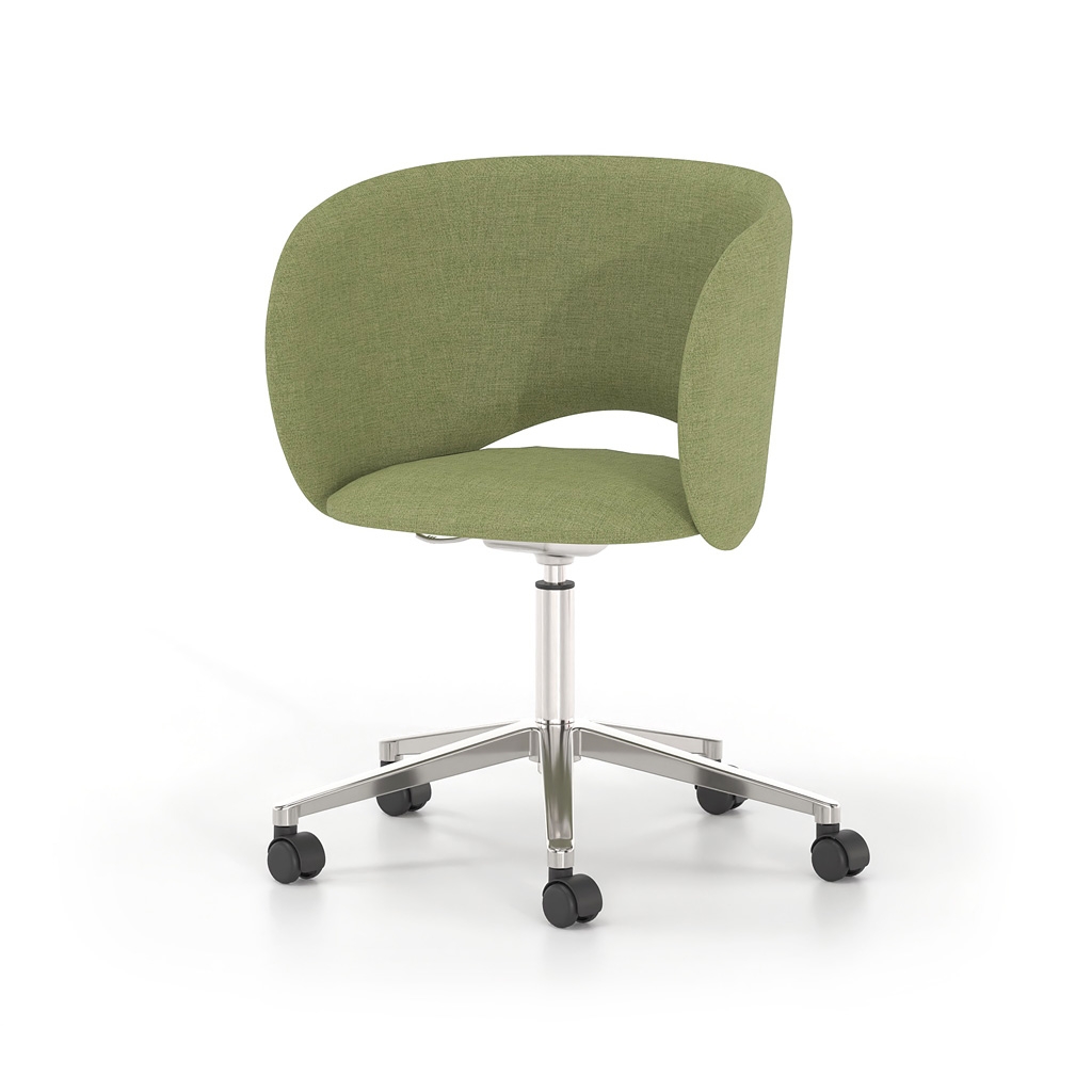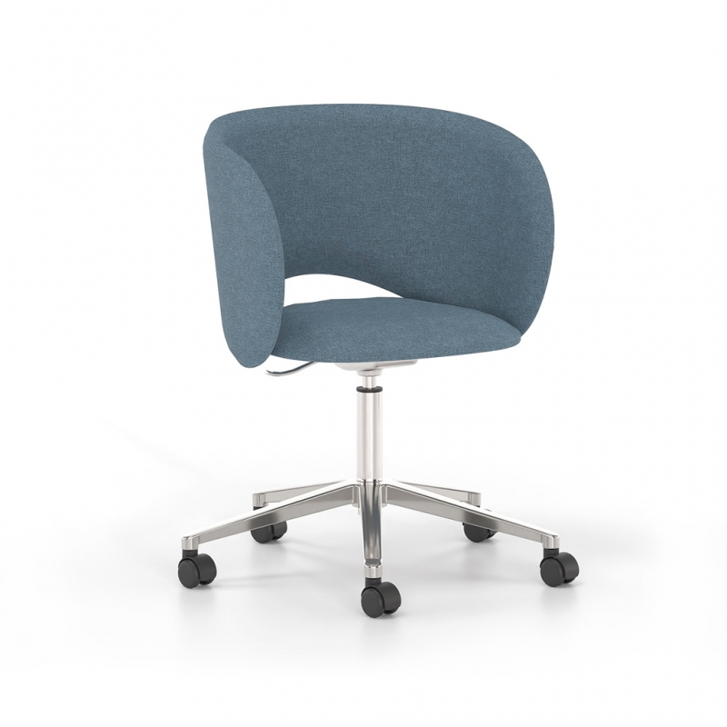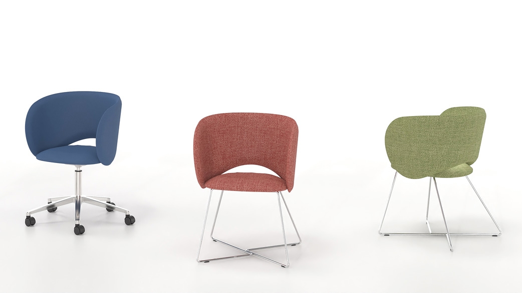 It is available with either a fixed metal base or a five-star swivel base with castors and height adjustment, covering a wide range of uses—from meeting rooms and waiting areas to reception offices and professional workspaces with elevated aesthetics. The extensive selection of upholstery and colors allows for seamless integration into any design scheme.