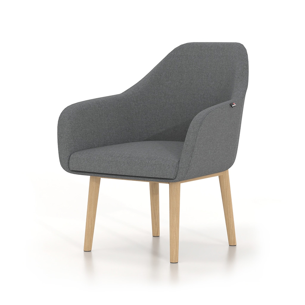 A modern and comfortable solution for meeting rooms, lounges, and waiting areas is the CALMA visitor chair. Designed with curves that embrace the body and a comfortable seat cushion, it offers a combination of aesthetics and functionality. The variety of colors and fabrics allows adaptation to any contemporary professional environment. The metal frame with oak finish completes the design, providing stability and subtle elegance.