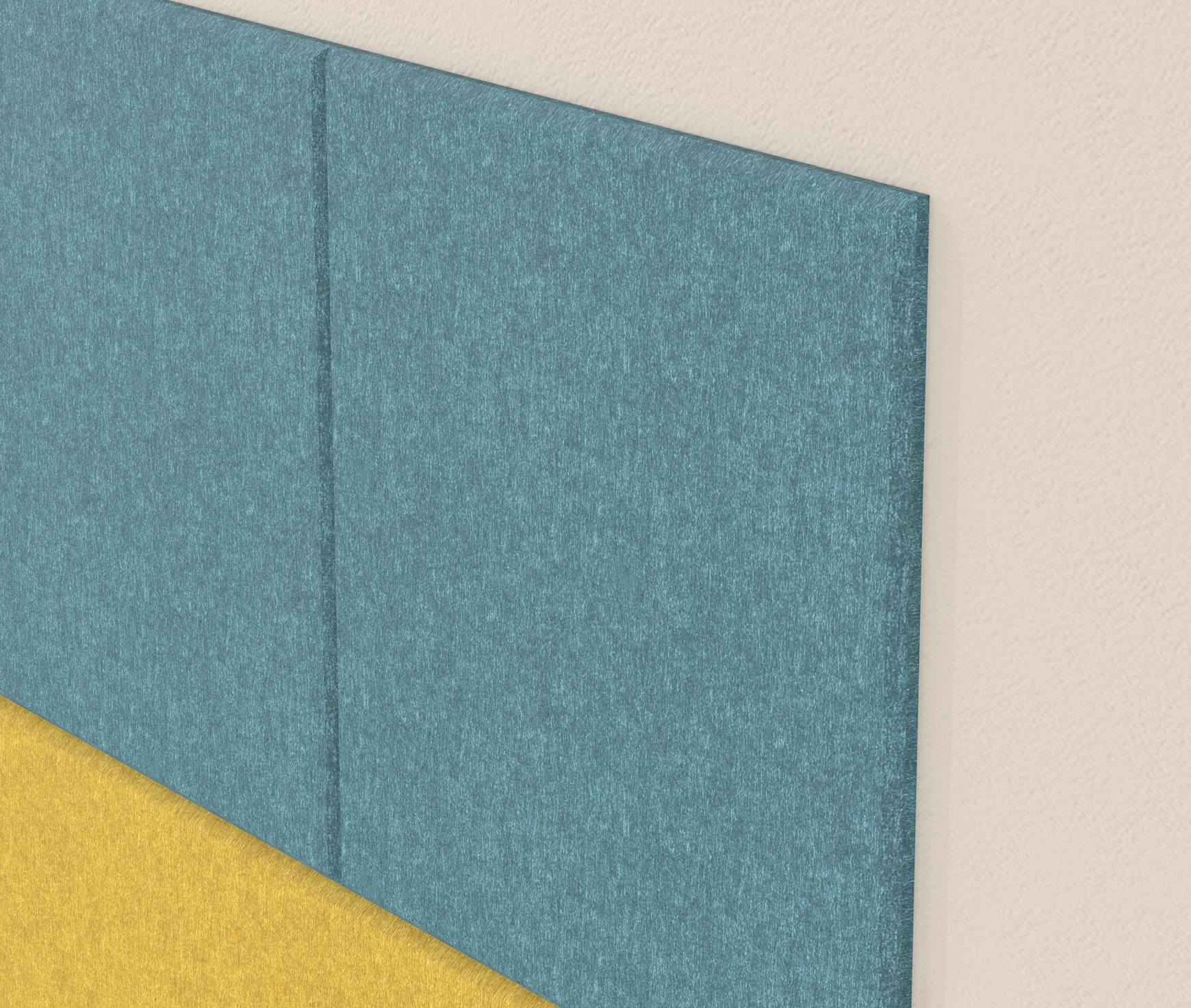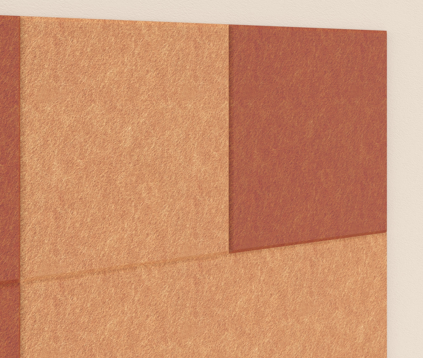 Wall-mounted acoustic panels are available in rectangular, square, and round shapes. They have a thickness of 18mm and are made from 100% PET felt (60% recycled PET fibers + 40% virgin PET fibers), a material with excellent sound-absorbing properties. Wall installation is achieved using suitable mounting materials or, alternatively, on the ceiling with a dedicated suspension system.