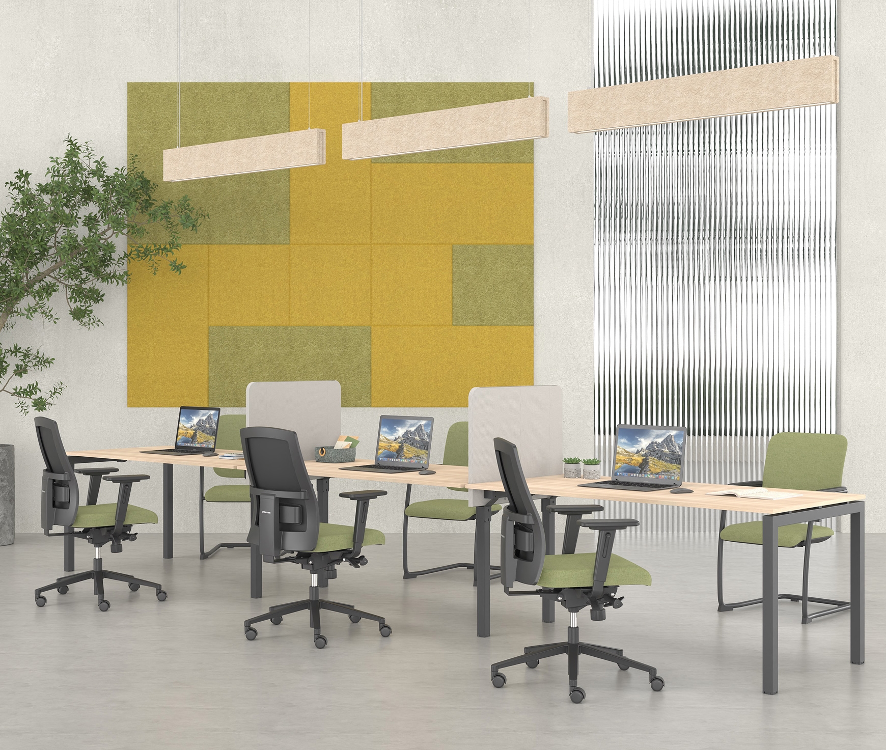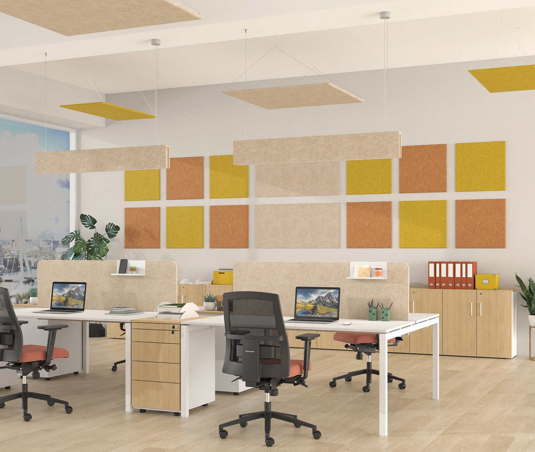 Ceiling-suspended acoustic panels are available in rectangular and square shapes. Also made from 100% PET felt with a thickness of 18mm, they provide high sound absorption and aesthetic balance in the space. Ceiling suspension is achieved via an adjustable-height hanging system, allowing adaptation to the needs of any environment.