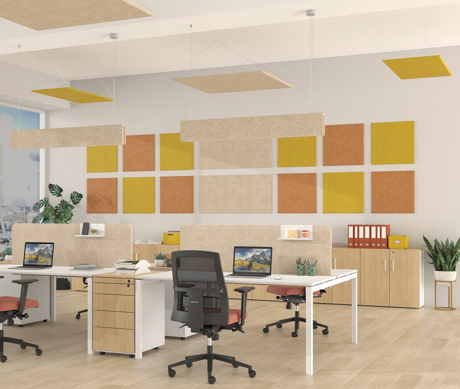 Les systèmes acoustiques de DROMEAS offrent une absorption sonore optimale sur les murs et les plafonds où ils sont installés. Fabriqués en PET à 100 % et d’une épaisseur de 18 mm, ils améliorent l’acoustique des espaces en absorbant les ondes sonores, en régulant la réverbération et en réduisant les bruits gênants, en particulier dans les lieux où la concentration de personnes accentue le problème des réflexions sonores. Parallèlement, leur esthétique contemporaine, disponible dans une variété de modèles et de couleurs, contribue à créer un environnement de travail agréable et harmonieux.