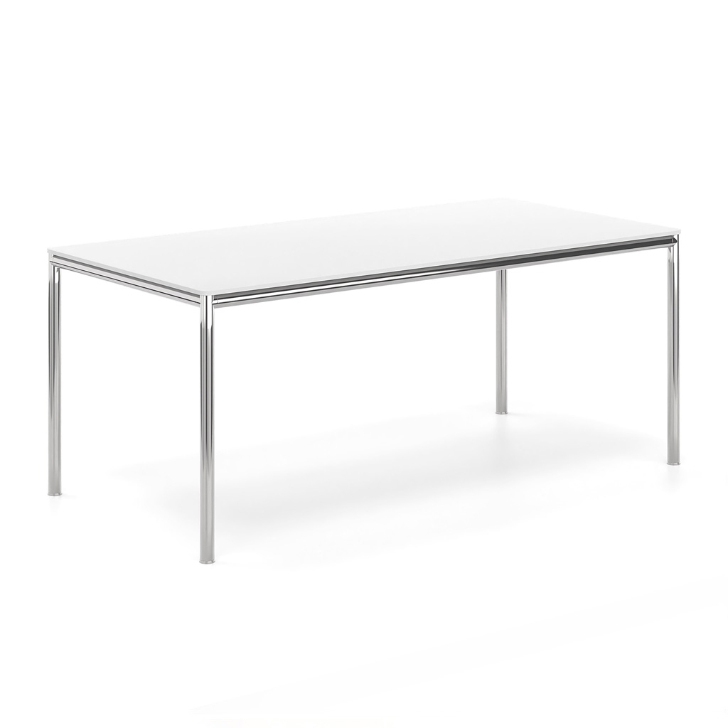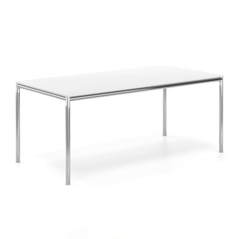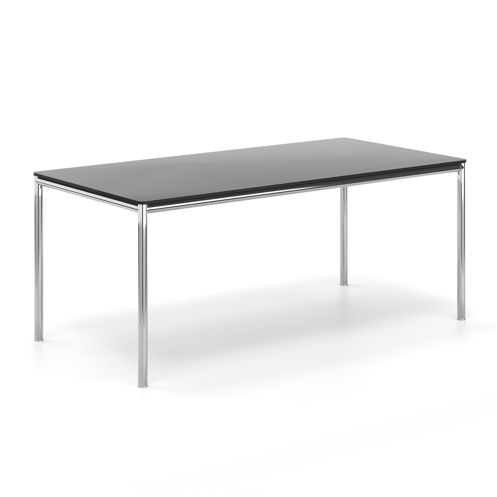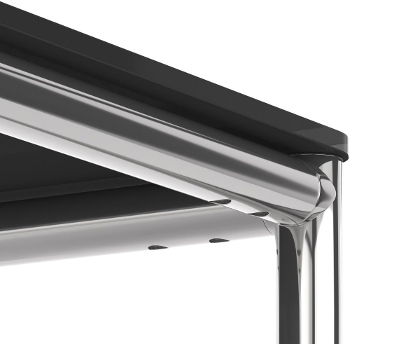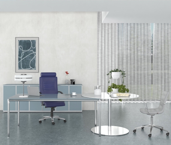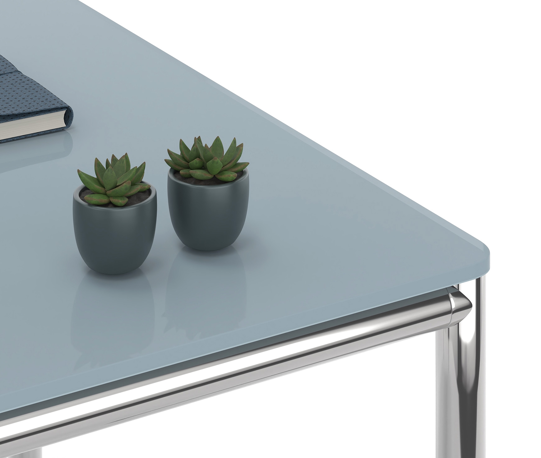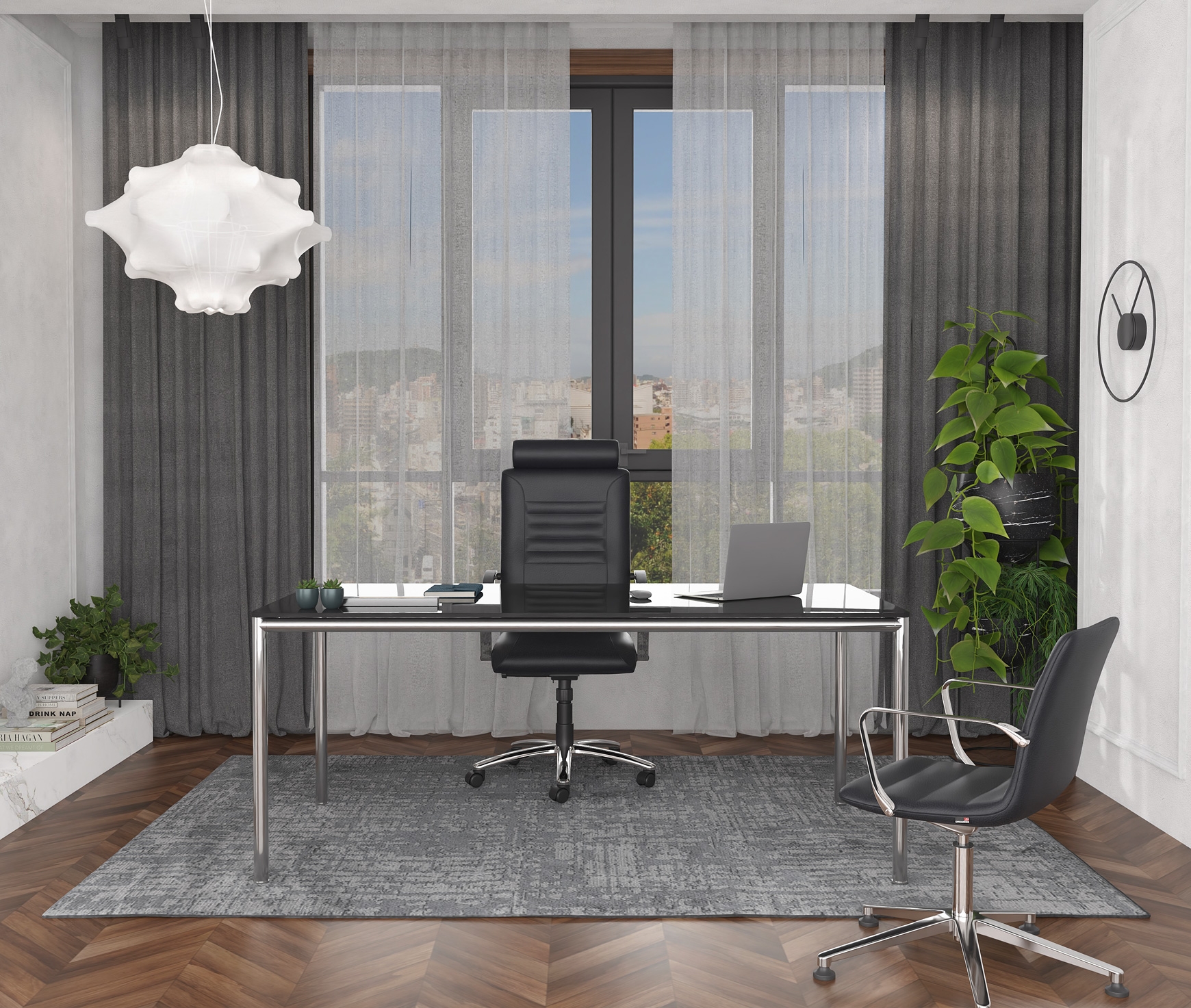 Construction high-tech minimale, présence élégante dans l'espace et fonctionnalité caractérisent le bureau de direction Slim. Les éléments ci-dessus, combinés à l'élégant cadre en métal inox et au verre de sécurité extra clair, rendent cette option essentielle pour tout cadre en quête de succès.