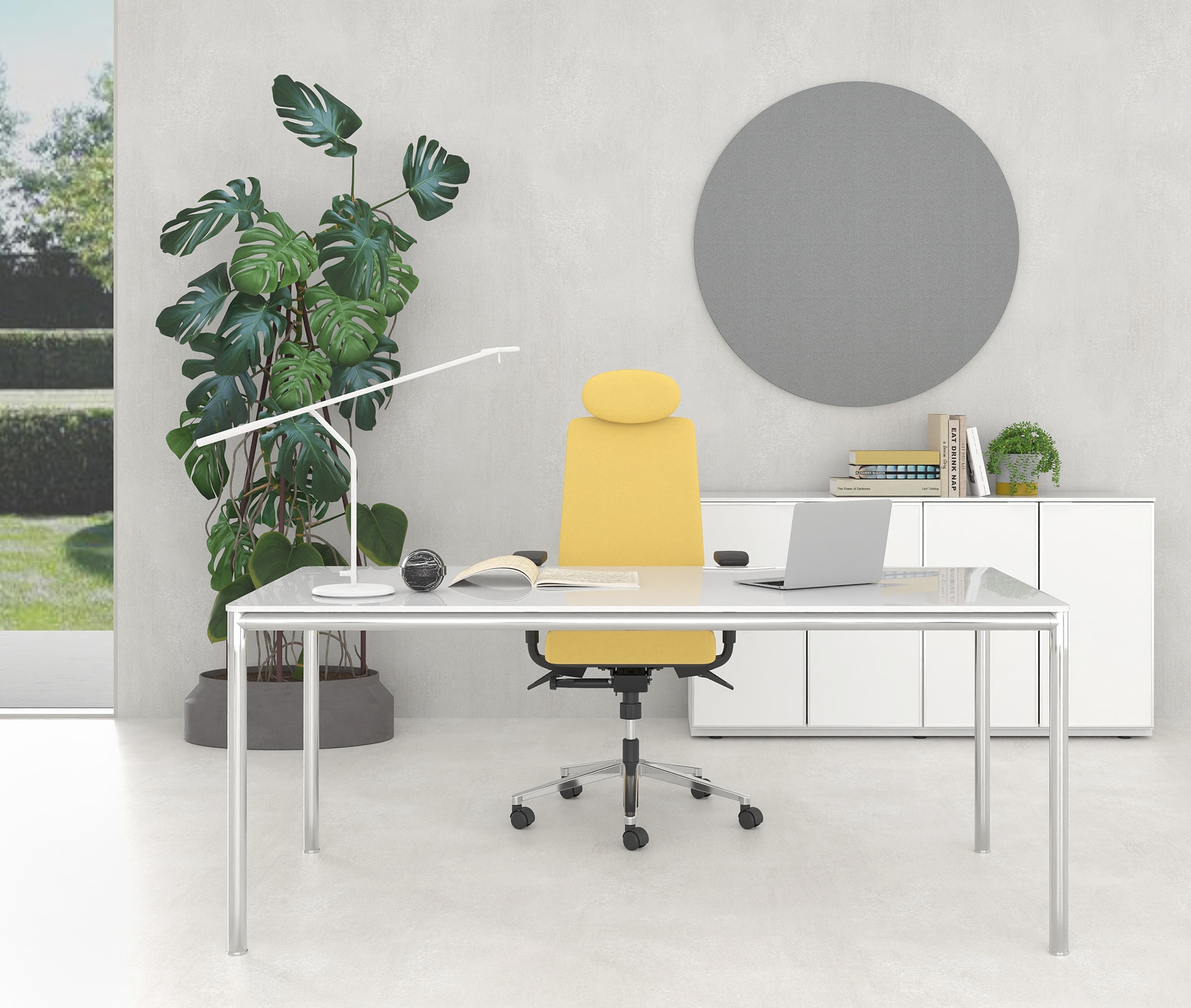 La série SLIM est une proposition moderne et innovante pour votre bureau de direction. Le verre laqué brillant et les pieds en inox forment une combinaison parfaite pour un bureau de direction moderne et élégant.