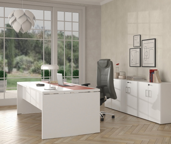Le bureau VIP est composé de panneaux de particules de 38 mm doublés de placage naturel pour répondre aux préférences de tout cadre exigeant. Alternativement, il est également disponible en laque.