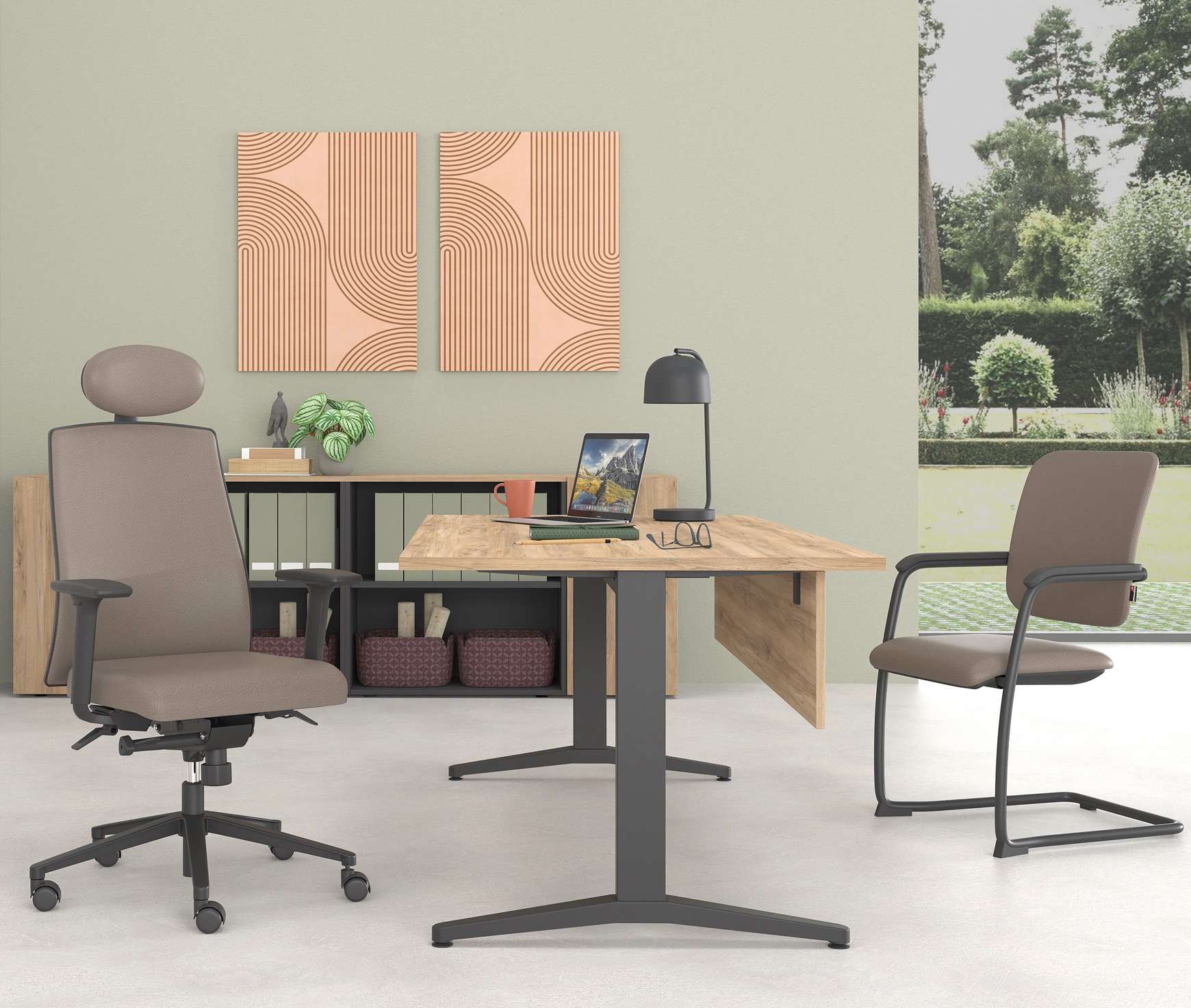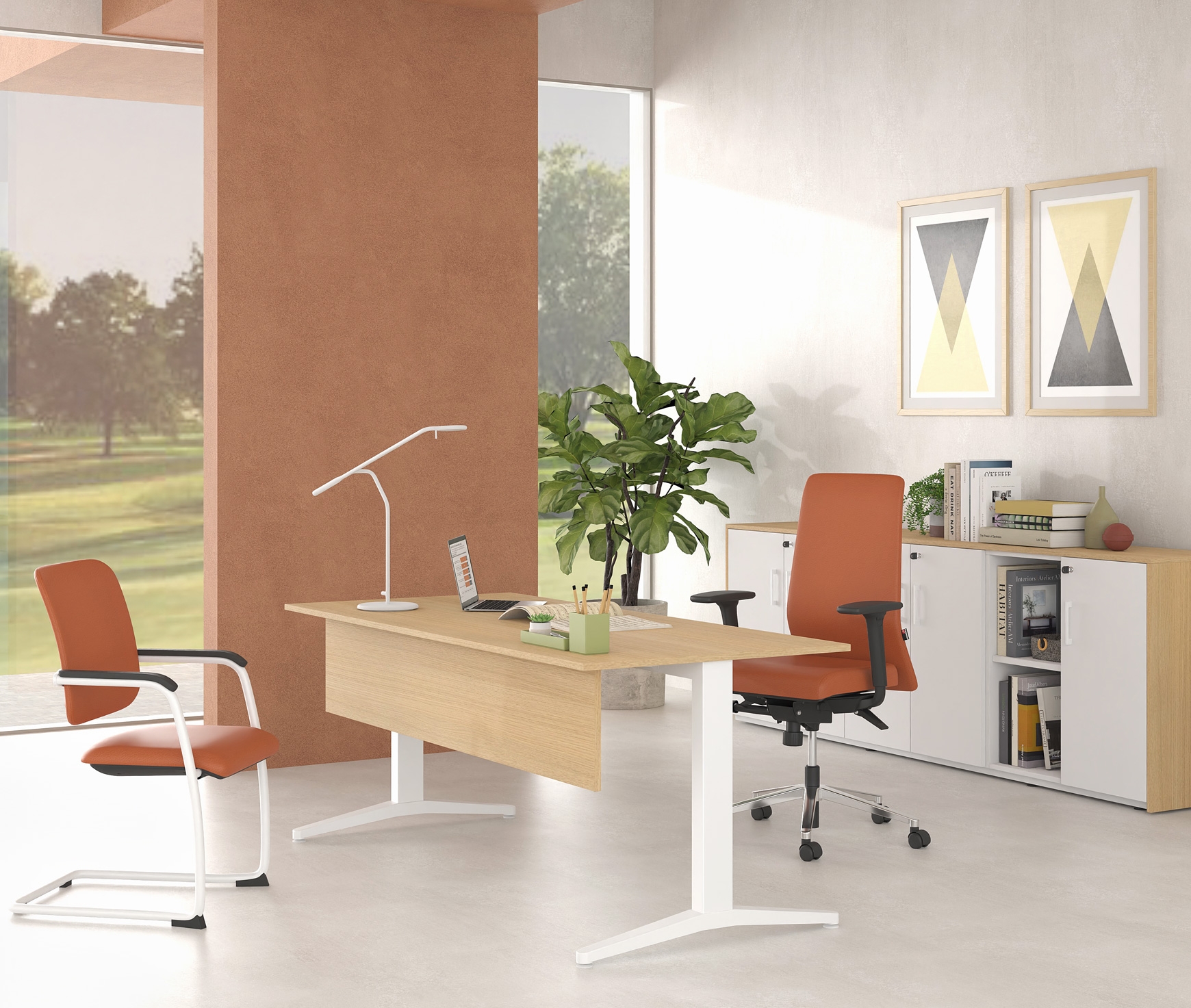 La série de bureaux ALMA s'est enrichie de solutions et de propositions de conception qui répondent aux besoins actuels de flexibilité et d'ergonomie dans le lieu de travail moderne. La principale caractéristique des bureaux de la série ALMA S est la construction robuste et l'élégance, grâce aux supports verticaux symétriques en forme de T.