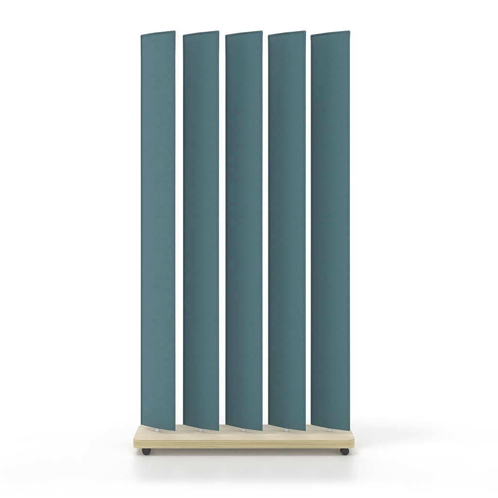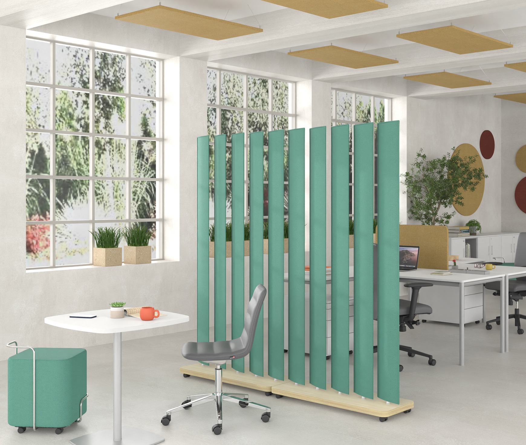 ABSORPTION ACOUSTIQUE - La construction des éléments verticaux à partir d'une combinaison de tôle d'acier, de feutre insonorisant provenant de bouteilles en PET recyclées et de tissus aux propriétés acoustiques, réduit la réverbération dans le spectre audible des personnes, améliorant ainsi l'acoustique du lieu de travail