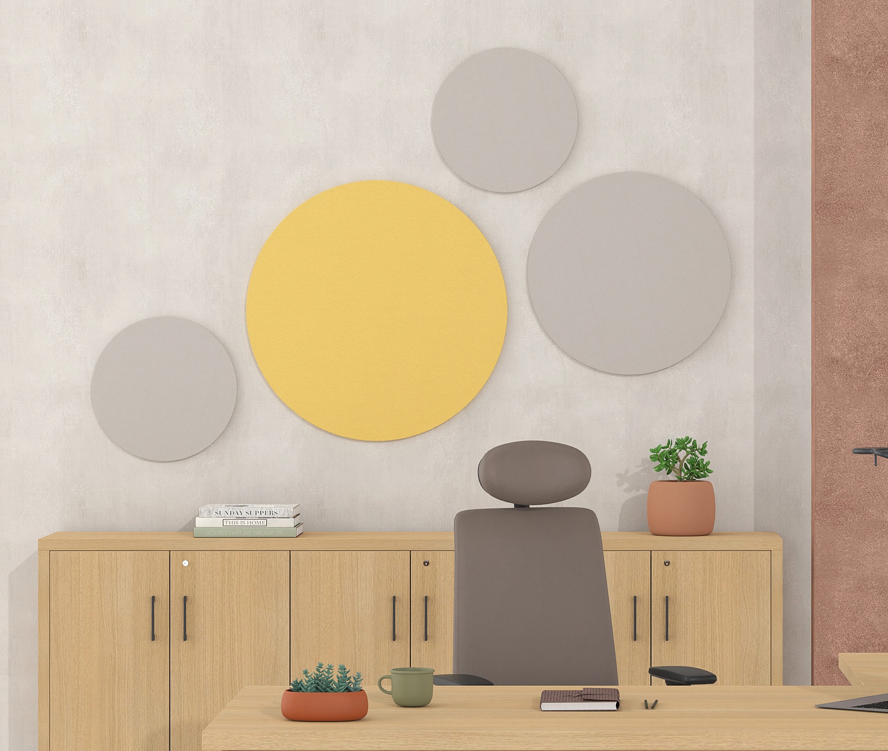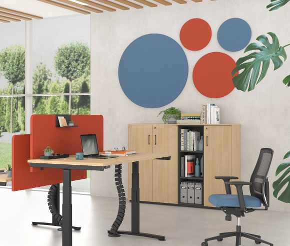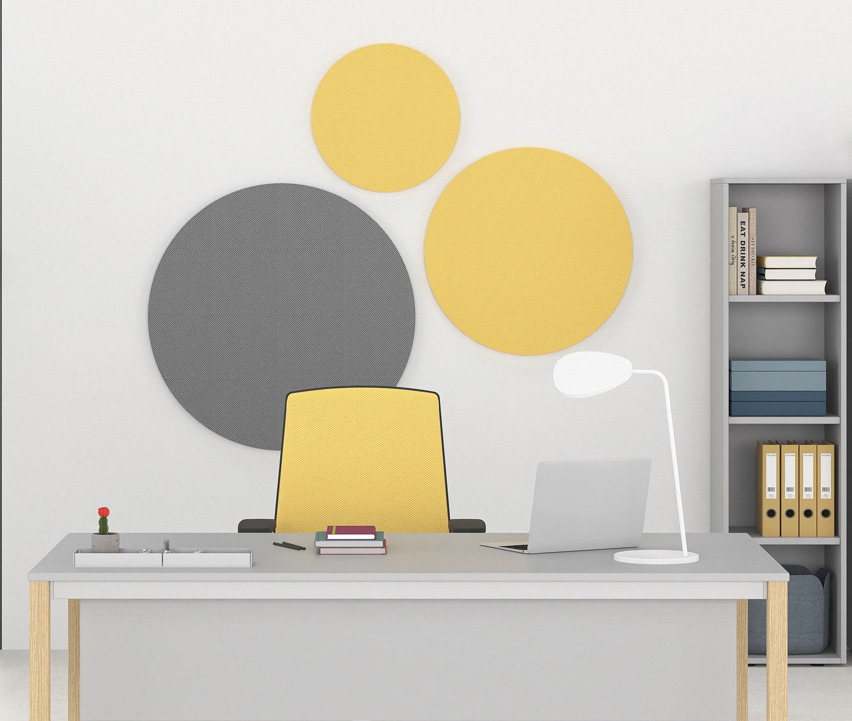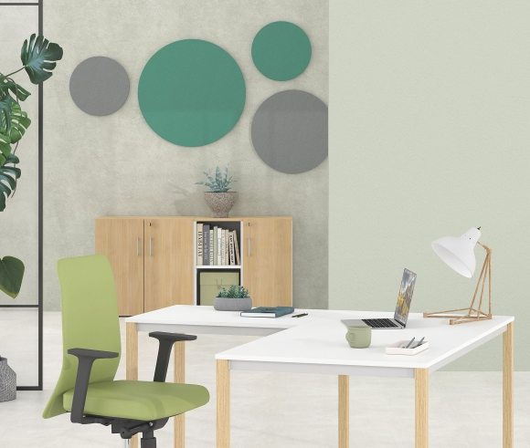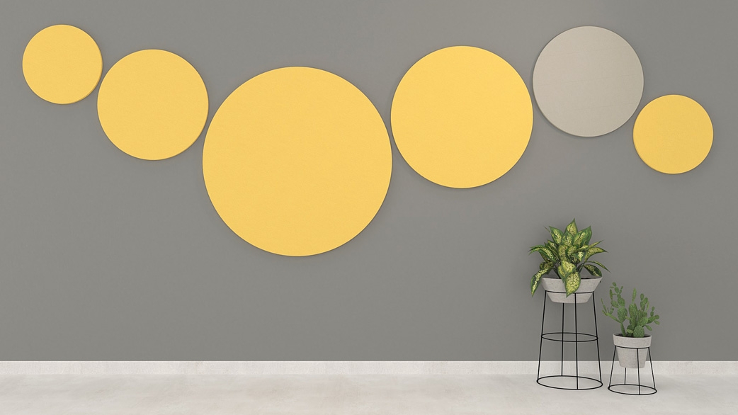 Les panneaux acoustiques muraux sont disponibles en formes rectangulaire, carrée et ronde. Ils ont une épaisseur de 18 mm et sont fabriqués en feutre 100 % PET (60 % fibres PET recyclées + 40 % fibres PET vierges), un matériau aux excellentes propriétés d’absorption sonore. L’installation murale s’effectue à l’aide de matériaux de fixation appropriés ou, alternativement, au plafond avec un système de suspension dédié.