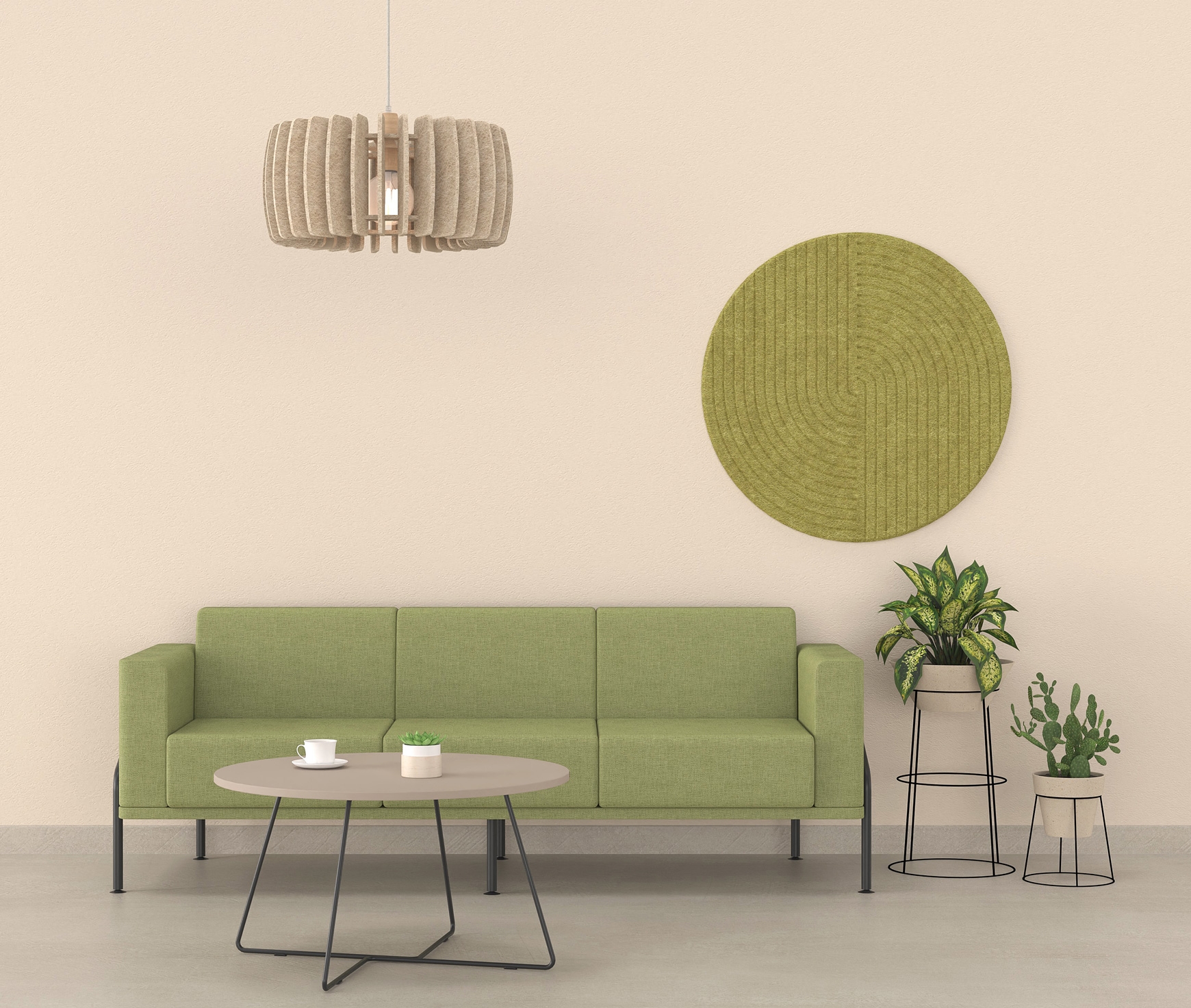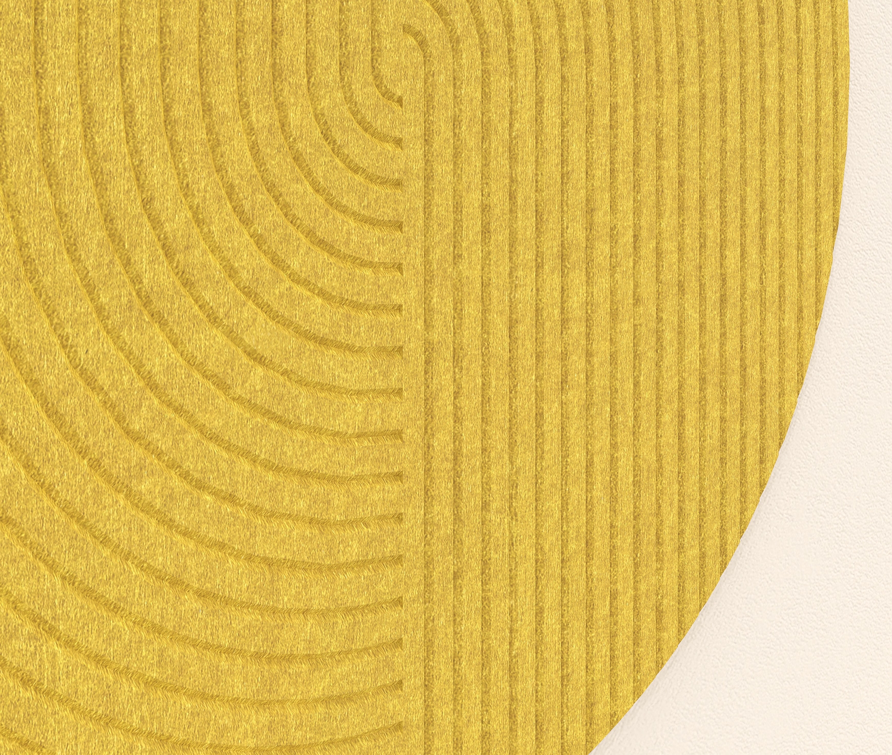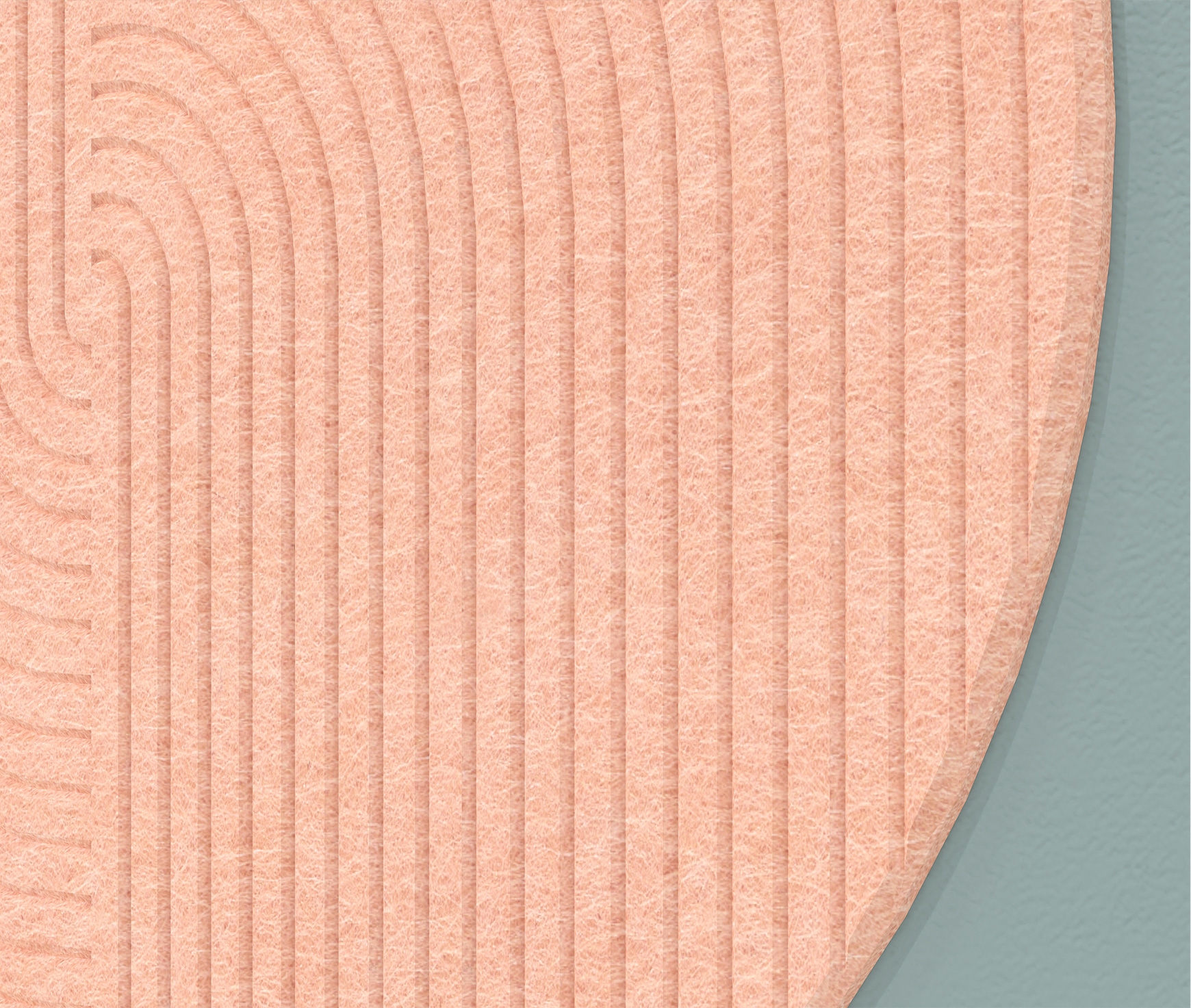 Les panneaux acoustiques muraux sont disponibles en formes rectangulaire, carrée et ronde. Ils ont une épaisseur de 18 mm et sont fabriqués en feutre 100 % PET (60 % fibres PET recyclées + 40 % fibres PET vierges), un matériau aux excellentes propriétés d’absorption sonore. L’installation murale s’effectue à l’aide de matériaux de fixation appropriés ou, alternativement, au plafond avec un système de suspension dédié.