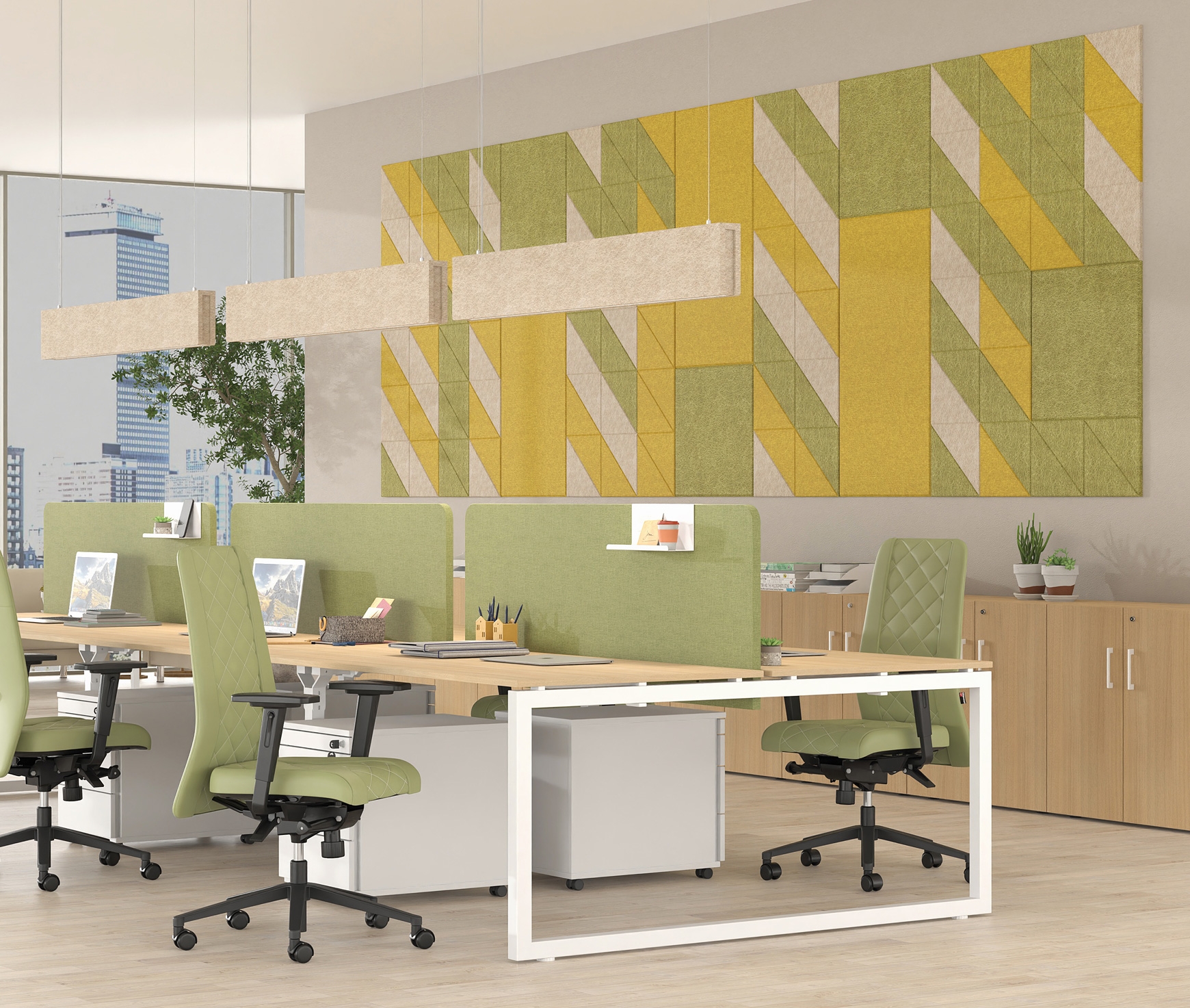 Les panneaux acoustiques suspendus au plafond sont disponibles en formes rectangulaire et carrée. Également fabriqués en feutre 100 % PET d’une épaisseur de 18 mm, ils offrent une forte absorption sonore et un équilibre esthétique dans l’espace. La suspension au plafond se réalise via un système de suspension réglable en hauteur, permettant l’adaptation aux besoins de chaque environnement.